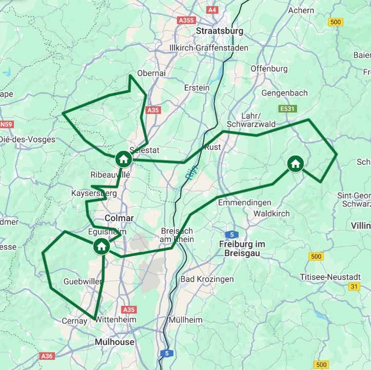 Vanuit Gueberschwihr voert de slotetappe ons noordwaarts over de beroemde Route des Vins d’Alsace, langs schilderachtige dorpen zoals Eguisheim en Kaysersberg, die tot de mooiste van Frankrijk worden gerekend. Tussen de wijnranken en de dorpjes ontvouwt zich een sfeervol landschap waarin traditie en natuur harmonieus samenkomen. Uiteindelijk bereiken we iets na de middag opnieuw Saint-Hippolyte, waar onze reis begon, en sluiten we de tocht in stijl af met uitzicht op het imposante kasteel Haut-Kœnigsbourg. Een waardige afsluiting van een extra lang weekend dat voelt als een volle week vakantie.