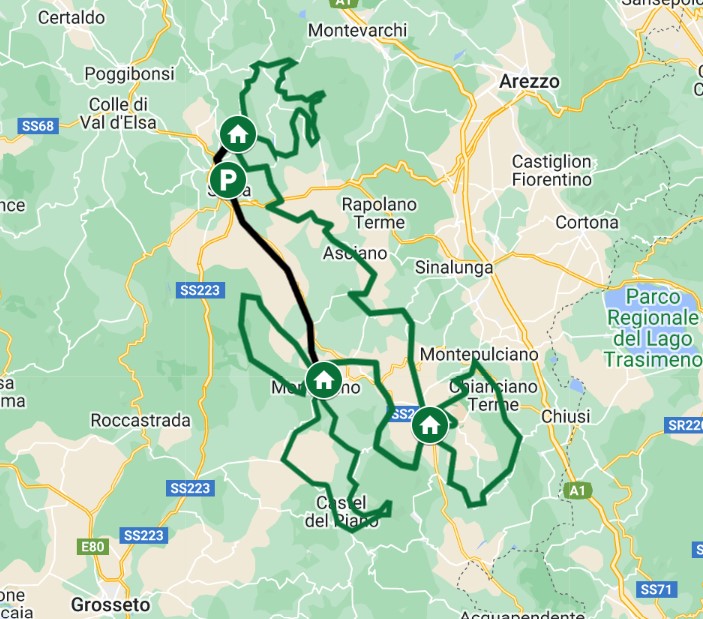 | Start reis | Siena station om 14u | Eerste accommodatie | Siena station om 14u |